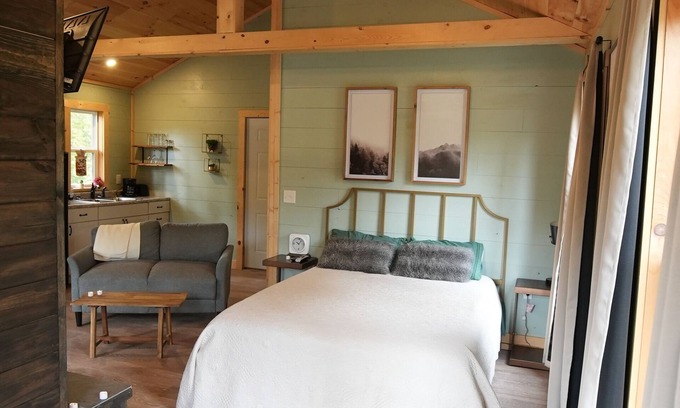 This is one of our newest additions for the Avenwood Cabins lineup! You will feel right at home in Owls Tale. Upon entering, you will be pleased to find our beautiful double-sided wood Burning fireplaces and the queen bed will get you feeling cozy right away. Step onto the porch for a soak in the hot tub, make your favorite meal on the charcoal grill, or relax with a fire. The perfect little getaway cabin to unplug and unwind! Every cabin is equipped with a Roku tv and Wi-fi.