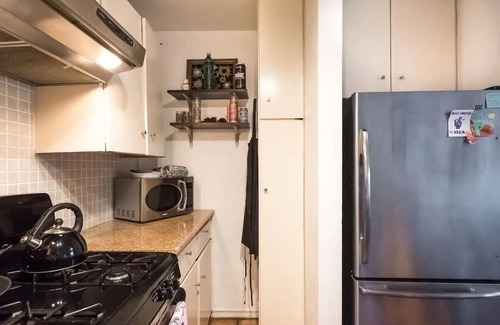 The master bedroom welcomes you with a brand new, sun-soaked king bed surrounded by windows, perfect for a serene retreat. A charming desk invites you to delve into a good book or pen your thoughts. In the second bedroom, find two comfortable twin beds and a convenient separate entrance to the bathroom, which features a shower/bathtub combo, ample counter space, and excellent lighting.