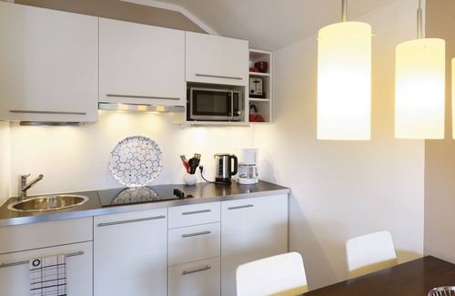 The recently renovated, modern apartment offers you a bedroom with a reading chair, reading lamp, double bed and large balcony, offering great views of the Zugspitze. In the small dressing room at the entrance they can store their street clothes and the nursery is equipped with two cots and a walk-in closet. The bathroom has a spacious shower, a toilet, a sink, a vanity mirror and of course a hair dryer. The kitchen is a dining area in the large living room and is equipped with dishwasher, ceramic hob, microwave, fridge, kettle, toaster and coffee maker and open to the living area. From there you have direct access to a balcony from which you can enjoy a view on the Alpine peaks. Or curl up on the sofa and enjoy a movie. Of course, a free Wi-Fi access is available.