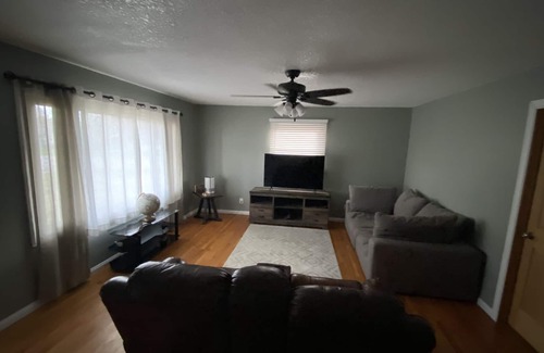 This fully furnished home is designed for an executuve stay or family coming in town for a visit to live as if they had never left home! All you will need to bring is your suitcase! Complete kitchen to cook up all your favorite meals. Living space to unwind and full basement to enjoy be entertained on the 70" flat screen with surround sound! Paito in the back with a grill to enjoy the peacefull small town setting. Washer and dryer included along with dishwasher to keep your stay at ease.
