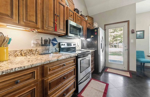 Holder Hideaway's downstairs offers a living room, kitchen with long bar, dining area, master bedroom and a full bath with spa tub. Washer and dryer are also located on the first floor. Venture upstairs to an open loft with TV and game table. Also upstairs are two more bedrooms, one having a Queen and Bunk Beds, and a full bath with spa tub.