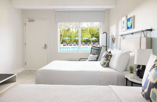 Enjoy the tropical ambiance of Blue Flamingo Resort, featuring lush gardens and vibrant poolside activities. This room provides two queen beds and overlooks the resort's lively pool area, ideal for families seeking both comfort and excitement.