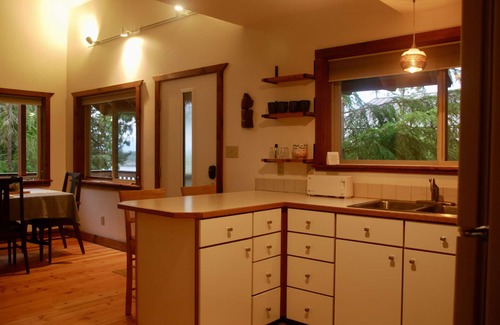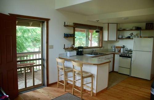The Cabin has been recently renovated with an emphasis on earth friendly products. Locally milled, sustainably harvested fir flooring with no-VOC finish throughout. Cedar beams from the original clearing of the property. A 'nap nook' and work desk are in the loft, along with a large screen TV, WiiU, DVD player and an assortment of family friendly DVDs to enjoy the pleasures of simpler times together. There is WiFi for email, surfing and streaming but due to our location limited speeds are not enough for uploading or downloading.