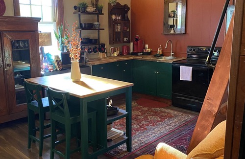 Newly-renovated church with 14-foot vaulted ceilings, large stained glass windows & decor from around the world. A one of a kind stay (see guest comments). Ideal location. 2-minute walk to The Elora mill, restaurants and the Elora Gorge hiking trail. 1,200 square feet of living space. Sleeping spaces are private and living spaces are open concept. Perfect for wedding parties, families and group getaways.