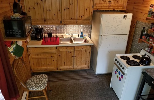 The cabin has plenty of parking for your vehicles, trailers or campers. It has its own private yard, a gas grill, wood burning fireplace and an outdoor firepit. The two bedrooms are upstairs, along with the bathroom, while the living room and kitchen/dinning area are down below. One bedroom has a queen bed, while the other is equipped with a single-over-double bunk bed which can sleep 3. In addition, the futon in the living room serves as an additional sleeping space for two, and is a great place to snooze in the winter while the wood stove roars.