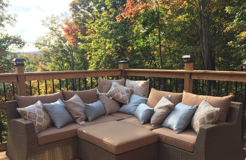 From the living room, open the patio door and explore the vast 20 x 19 foot terrace. Oriented to the south, it offers a spectacular view of the valley and Mont-Tremblant and a magnificent sunset. A beautiful and large stainless steel barbecue (Napoleon) is also at your disposal (two propane tanks provided)