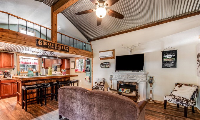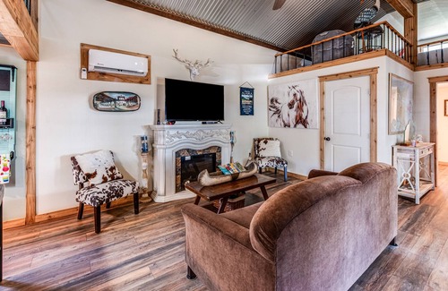 When night falls, the queen-size bed offers a cozy spot to lay your head. Guests will find additional sleeping accommodations for two with the full-size sleeper sofa, and an extra cot is provided. The full-size bathroom is stocked with plenty of fresh towels. Additional amenities at The Getaway Cabin include free Wi-Fi, Roku TV and dedicated parking for 2 vehicle. This gorgeous cabin shares outdoor space with its sister cabins. Enjoy a game room, outdoor seating and charcoal grill. Each cabin has its own fire pit and outdoor seating.
