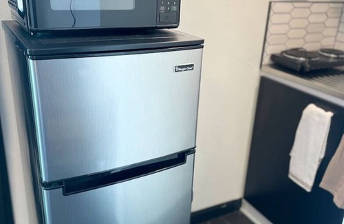 ►This cozy space boasts a sleek kitchenette, a clean and modern bathroom with a shower, and stunning wall art that adds a touch of sophistication! Bright and inviting atmosphere!