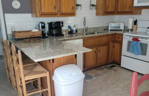 Set in a wooded rural neighborhood, this 2-level house has all the comforts of home: 3 bedrooms, 2 baths, eat-in kitchen with granite counter tops, game room, living room, laundry room with washer & dryer, wireless internet, 2 large decks, gas grill, fire pit, carport and plenty of additional parking. Home sleeps 8 easily. Close to restaurants, marina, and store/gas station. Owners/operators live next door.