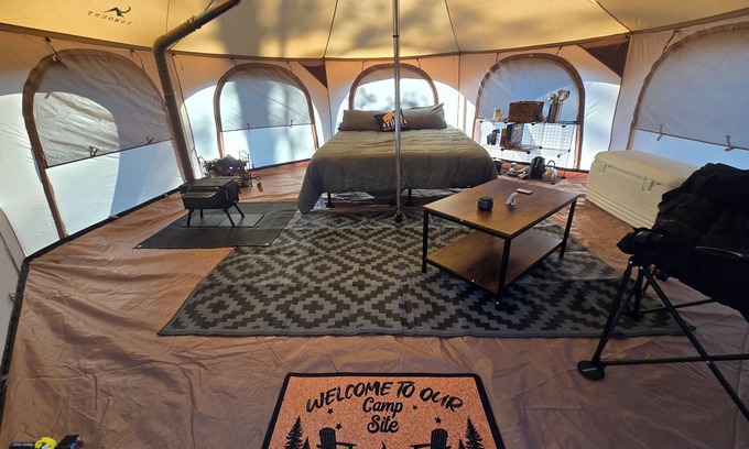 Discover our unique 16-foot yurt campsite, nestled on a 300-acre family farm with over 300 animals. This charming, cozy yurt offers a rustic yet comfortable escape, perfect for those seeking adventure and tranquility. Explore 2.4 miles of ATV hunting trails, or bring your dirt bike to zip around the paths. Just 3 minutes away, you can enjoy fishing and swimming at the nearby beach.