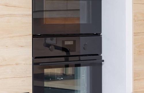 Fridge with freezer, kettle, induction hob, microwave, oven, dishwasher, glass cups, crockery set, cutlery, frying pan