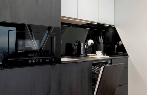 Cutlery and crockery set, cups, glasses, pan, pots, wine glasses, capsule coffee machine, induction hob, steam absorber, refrigerator, freezer, electric kettle, dishwasher, oven, microwave