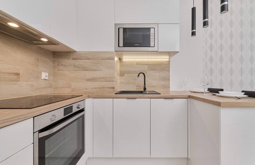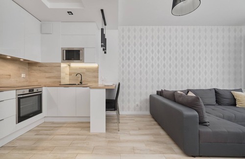 The flat is located in a residential area on Zakładowa Street in Wrocław. It is a great location for those looking for a quiet, quieter area, less than 3 km from the market. It is surrounded by many cycling and jogging paths, as well as beach areas on the Oder River with recreational zones. The surrounding area is vibrant with café and restaurant life, giving guests the opportunity to experience the local culinary scene. Numerous shopping and service outlets cater for all daily needs. The location is also an excellent base for exploring Wrocław, with a well-developed public transport network providing easy access to the city centre. Within the estate there is an Aldi shop, banks, restaurants, a drugstore, a bakery or a children's playground.