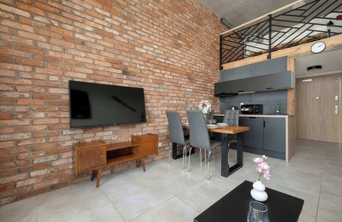 This stylish studio with a mezzanine has been designed with a modern, loft-style feel. This space is perfect for couples and families with children. The central living room features a comfortable sofa and dining table, perfect for sharing meals and conversations. The kitchen is equipped with modern appliances, including a dishwasher, an electric cooktop with a hood, a refrigerator with a freezer, a microwave, and a kettle. The mezzanine features a double bed, and a fold-out sofa in the living room provides additional sleeping space. This space can accommodate up to four people. The bathroom features a modern shower, a washing machine, a hairdryer, and practical features to make everyday life easier.