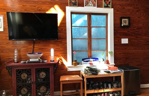 The decor is primarily Zen, inspiring you to relax. In addition, there is a local 100 year old, live edge pass-through to the back deck - where you will also find a dining table to enjoy your coffee & a paper, happy hour or any meals.