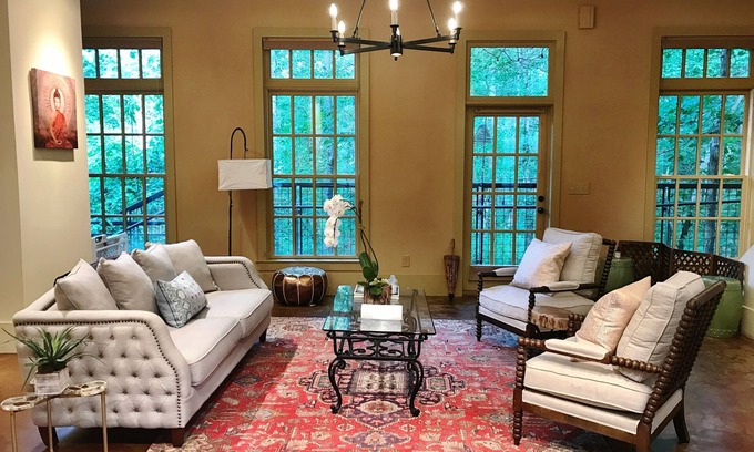 SANGHA HOUSE is a beautiful 3 story town home in the heart of Serenbe. Each floor overlooks a protected wooded area studded with birds and full of meandering streams. The premiere walking trails of Serenbe are simply steps away from your front door. Owned by a mindfulness-based psychotherapist & international wellness guide and her husband, this space has been energetically created to help you let-go and reclaim the joy of living.