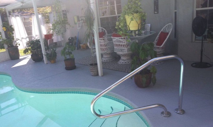 The fish pond and watering/ care of all plants is maintained by owner. Enjoy feeding the Koi while sitting in the garden. (1 scoop per day) The plants located in the pool enclosure as well as the pool maintenance may require attention; if you are staying longer than a week, arrangement will be made to take care of pool and plants in this private area with your permission. The pool is maintained by Ryan every Friday and he will gain access through the screen room on street side of enclosure.