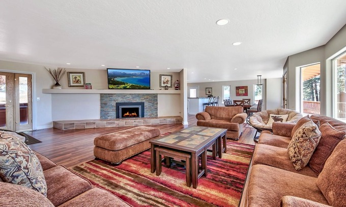 Come and make great memories in this amazing lake view mountain getaway. With room for up to 10 guests. This spacious, 3,800 square foot residence exudes Tahoe charm with a massive great room that boasts an inviting stacked stone fireplace, a 70 inch TV and large windows to capture the serene views of tall pines whispering in the wind and a beautiful backdrop of the Lake. There’s also two different levels for entertaining to give your group some relaxing space. The main floor offers a large private hot tub and massive deck with a large bbq, dining table for 6, sofa seating for 7 with a fire pit for entertaining while enjoying the great outdoors of Tahoe. The other entertainment room features a new 12 foot Shuffleboard table that everyone will love. The home has two kitchens for convenience when cooking for those large gatherings and for those who love their Java, there's a premium espresso/coffee maker in the main kitchen! Conveniently located in the desirable Zephyr Heights neighborhood, this property is ideally situated within minutes to the summertime activities of Zephyr Cove Resort or the winter fun at Heavenly Mountain Resort. Combined with fabulous dining, casino gaming, shopping and entertainment, your Lake Tahoe vacation will be one to remember!