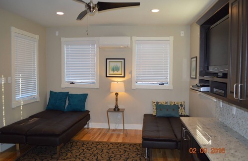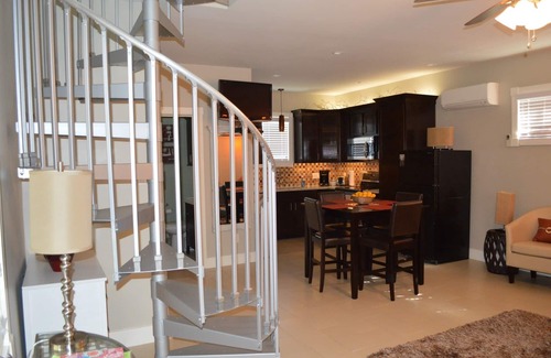 Modern, nicely decorated casita, our guest house, 1 BR, 1.5 bath in the heart of the Zilker neighborhood, walking distance to restaurants and downtown. Highlight is a terrace with fabulous downtown view. It is very private, set in the back of our spacious property. A great place to vacation and enjoy Austin. Quiet neighborhood where everyone knows each other. Perfect place to make home base while exploring Austin. Close to Zilker Park where ACL is held, downtown and famous South Congress district are also nearby.