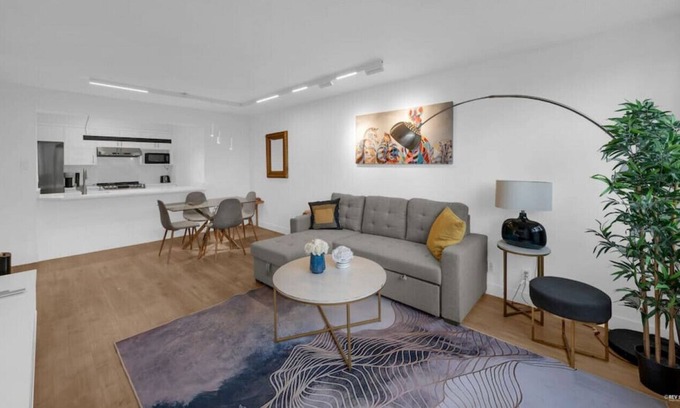 The kitchen is fully stocked with culinary set, kettle, Nepresso Coffeemaker, toaster. The dining area has seating for 4, along with all the necessary dinnerware, and more.