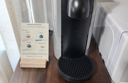 Coffee station features Nespresso coffee maker, drip coffee maker and french press available for guest use.